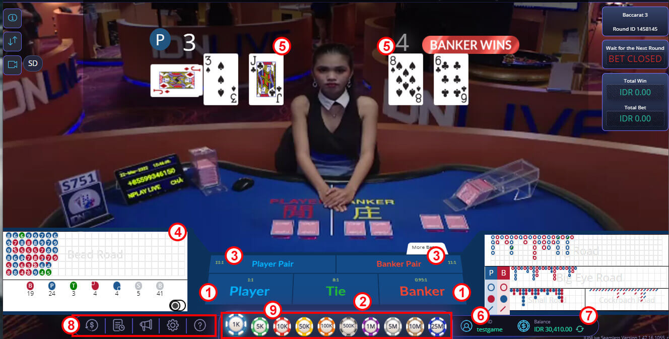 Bandarlah yang memenangkan permainan karena Three of a Kind dealer berperingkat 7.